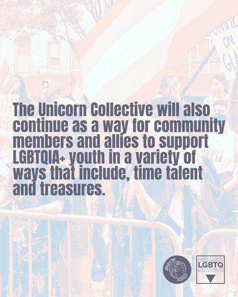 40% of homeless youth in California identify as LGBTQ and family rejection is the #1 reason why LGBTQ kids are on the streets. Unicorn Homes is a program within the North County LGBTQ Resource Center that aims to provide crisis and transitional housing to LGBTQ youth (18+) who are homeless or at risk for homelessness. A safe place to reside for a period of 14 days or more (youth that are minors will be hosted within a certified foster care family, youth 18yrs + and regular families that are LGBTQ supportive).The function is to provide housing stability with an ultimate goal to reunite families and rectify problems whenever possible. Unicorn Homes also provides paths to mental health resources, job readiness, life coaching, and independent living skills.